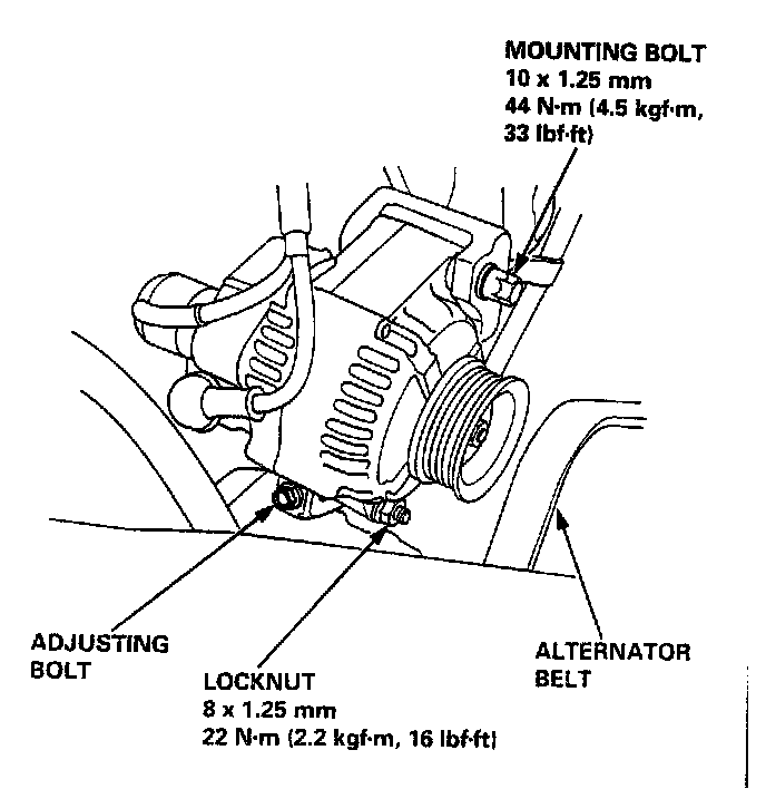 4. Loosen the adjusting bolt, mounting bolt and locknut, then remove the alternator belt.