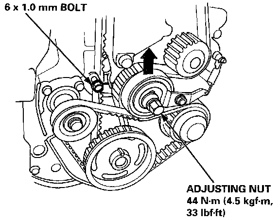 - Lock the timing belt adjuster arm in place by installing one of the 6 x 1.0 mm bolts.