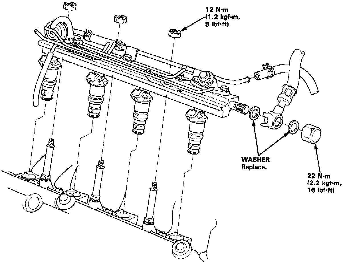 17. Connect the fuel hose to the fuel rail with new washers.
