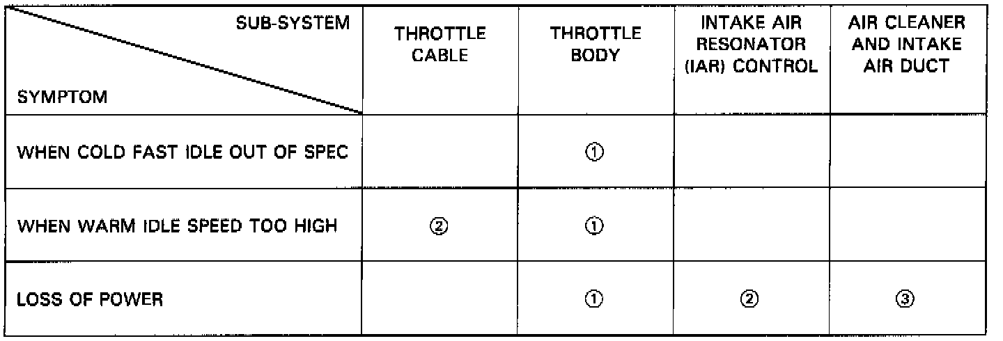 NOTE: Across each row in the chart, the sub-systems that could be sources of a symptom are ranked in the order they should be inspected starting with (1). Find the symptom in the left column, read across to the most likely source. If inspection shows the system is OK, try the next most likely system (2), etc.