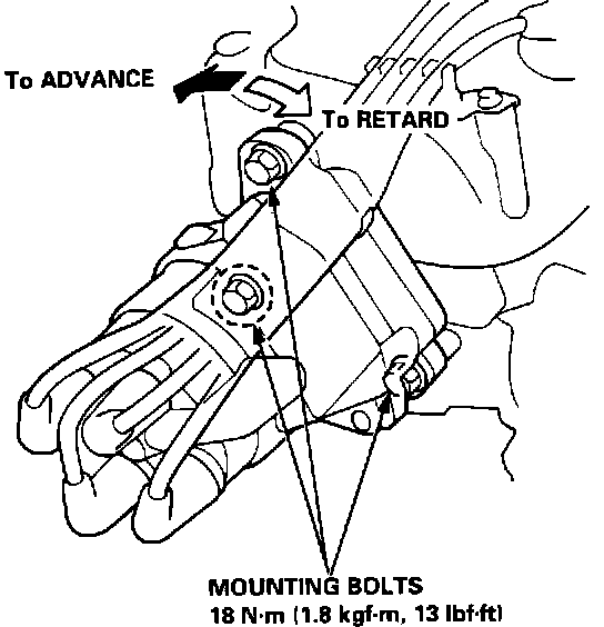 5. Adjust as necessary by loosening the distributor adjusting bolts, and turn the distributor housing counterclockwise to advance the timing or clockwise to retard timing.