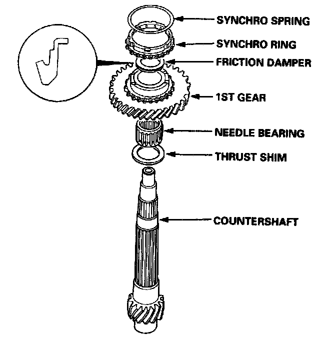 1. Install the thrust shim, needle bearing, 1st gear, friction damper, synchro ring, and synchro spring.