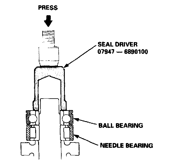 4. Install the needle bearing and the ball bearing using a special tool and a press as shown.