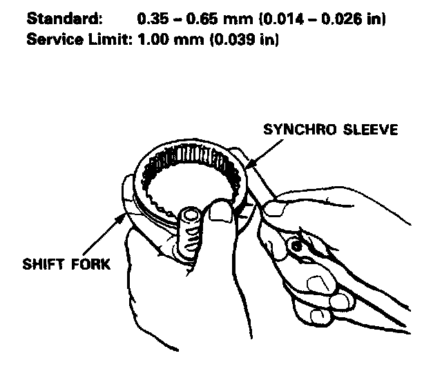 NOTE: The synchro sleeve and synchro hub should be replaced as a set.1. Measure the clearance between each shift fork and its matching synchro sleeve.
