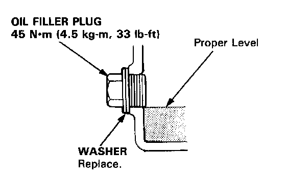 2. The oil level must be up to the filler hole. If it is below the hole, add oil until it runs out, then reinstall the oil filler plug.