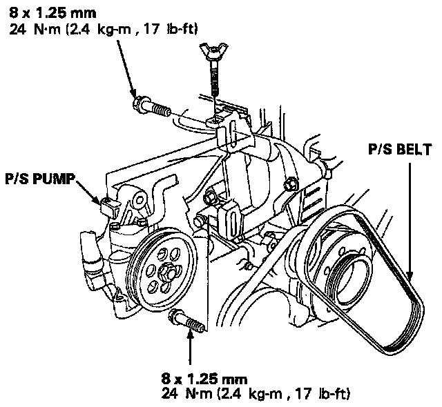 2. Remove the power steering (P/S) pump. Do not disconnect the P/S hoses.