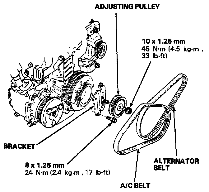 3. Remove the A/C compressor adjusting pulley with bracket and the belt (with A/C), then remove the alternator belt.
