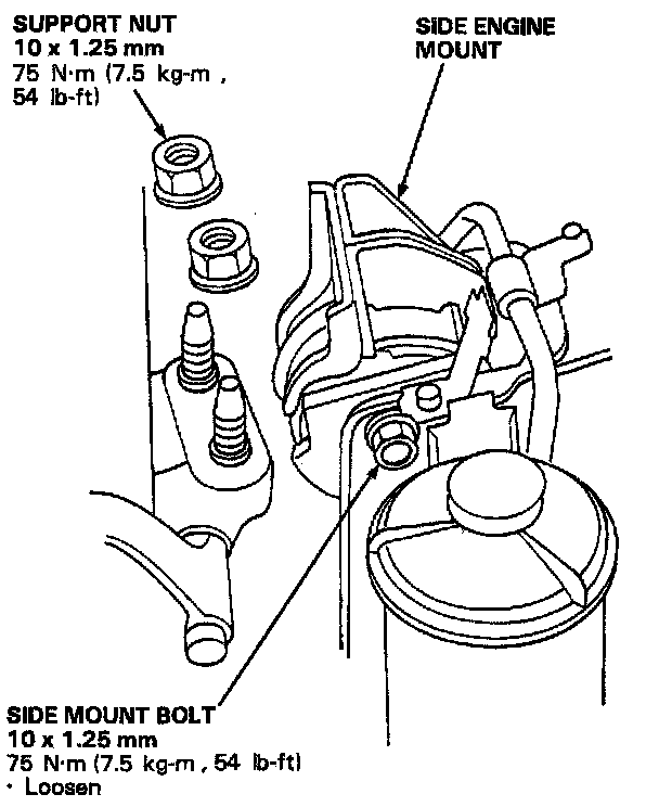 7. Remove the engine support nuts. Loosen the mount bolt and pivot the side engine mount out of the way.