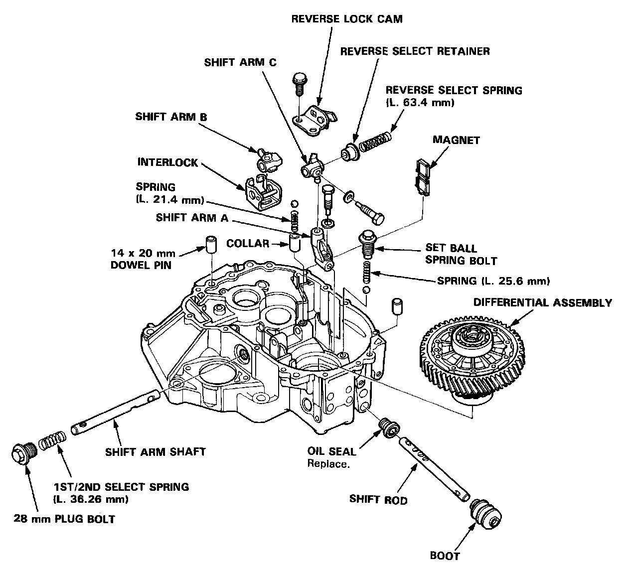 6. Remove shift arms C and B, and the interlock, then remove the reverse select spring and reverse select retainer.