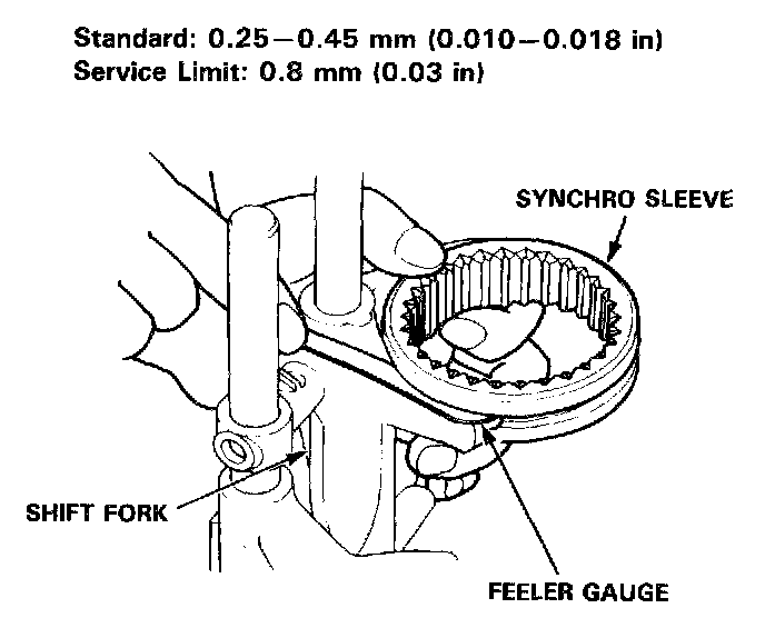 1. Measure the clearance between each shift fork and its matching synchro sleeve.