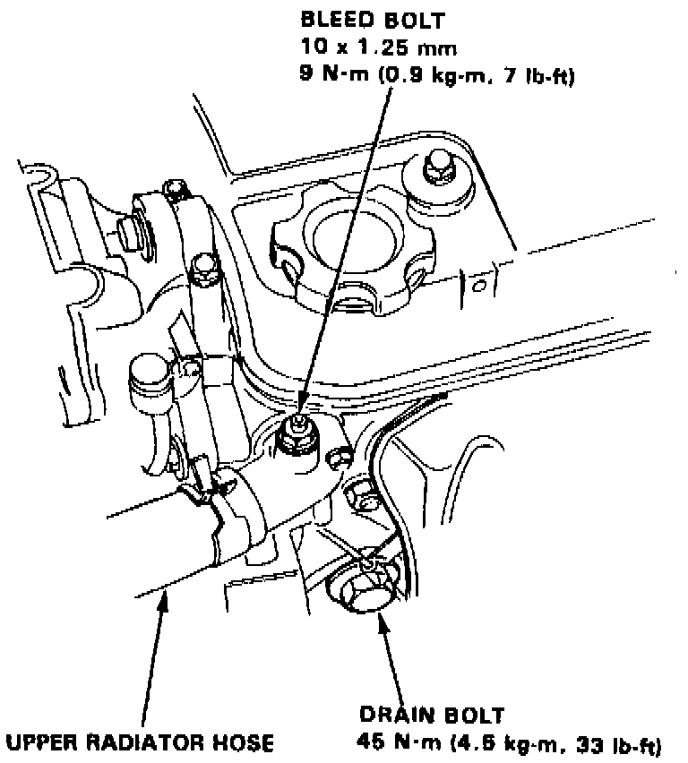 6. Tighten bleed bolt to specifications as soon as coolant starts to runout in a steady stream without bubbles.