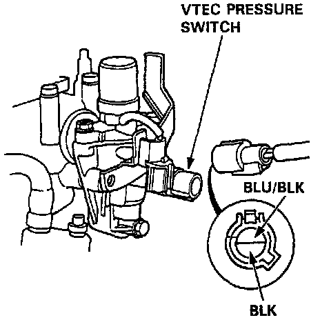 3. Disconnect the two pin connector at the VTEC Pressure Switch. Check for continuity between the terminals on the switch. If no continuity measured, replace switch.