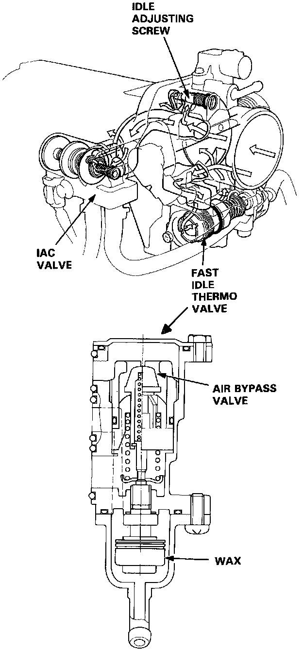 Controlled by a thermowax plunger type valve. When the engine coolant is cold, the thermowax contracts the plunger which opens the valve allowing air to bypass the throttle plate and idle adjusting screw into the intake manifold. When the engine coolant warms up, the valve closes and the bypass air flow is blocked.