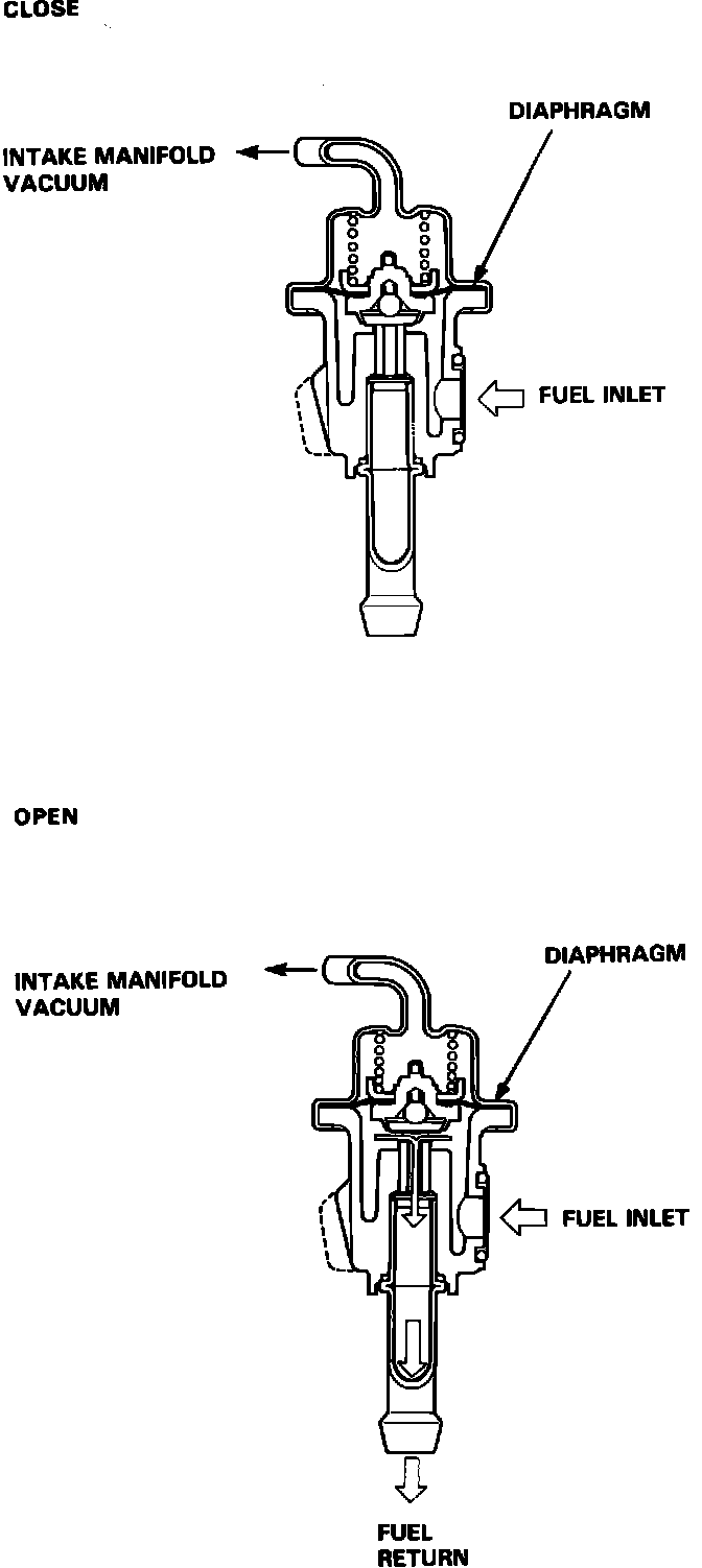 The Fuel Pressure Regulator monitors the intake manifold pressure (manifold vacuum) as long as the difference between manifold pressure and fuel system pressure is less than 3.0 kg/cm2 (43 psi) the valve remains closed. When the difference exceeds 3.0 kg/cm2 (43 psi), the valve opens and the excess fuel is fed through the fuel return line back into the Fuel Tank.