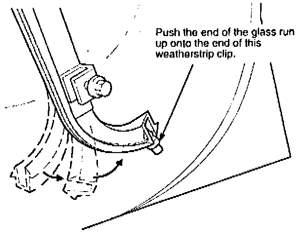 4. Remove the door speaker and its housing. Then reach through the hole in the door panel, and pull the end of the glass run all the way down into position. Push the excess glass run forward under the end of the channel and up past the end of the weatherstrip clip, as shown, to keep it in place.
