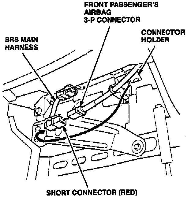 3. Remove the short connector from its holder. Disconnect the passenger's airbag 3-P connector and install the short connector.