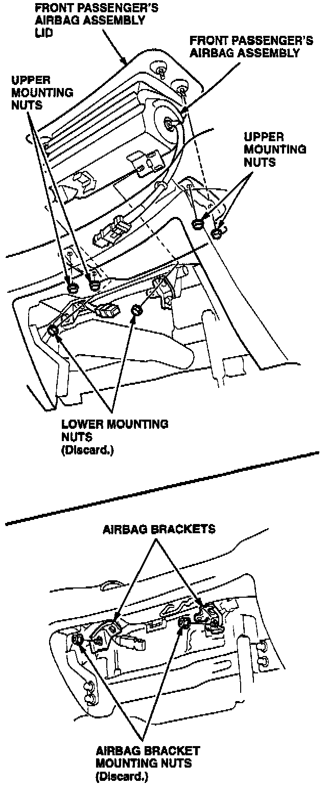 5. Remove the six airbag assembly mounting nuts, and the two airbag bracket mounting nuts. Carefully lift the airbag out of the dashboard. Discard the lower mounting nuts and the bracket mounting nuts.