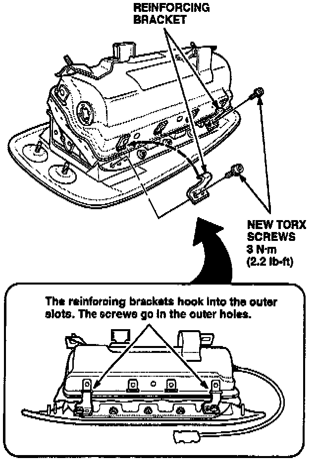 8. Reinstall the airbag in the dashboard. Replace the original bracket mounting nuts and the lower mounting nuts with new nuts from the kit. Use the original upper mounting nuts. Tighten the upper mounting nuts first, then tighten the lower mounting nuts and bracket nuts. Tighten all eight nuts to 10 N-m (7.2 lb-ft).