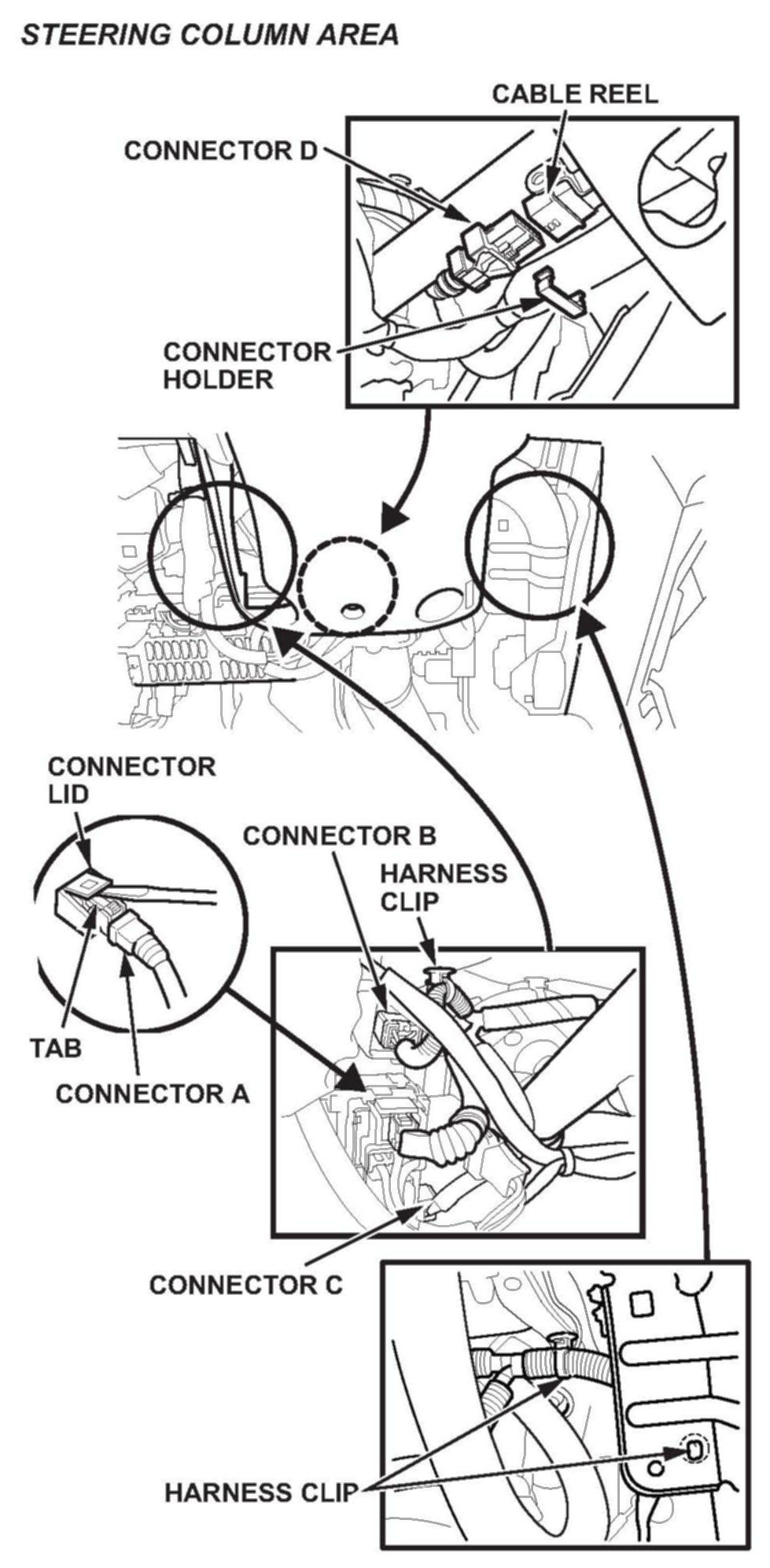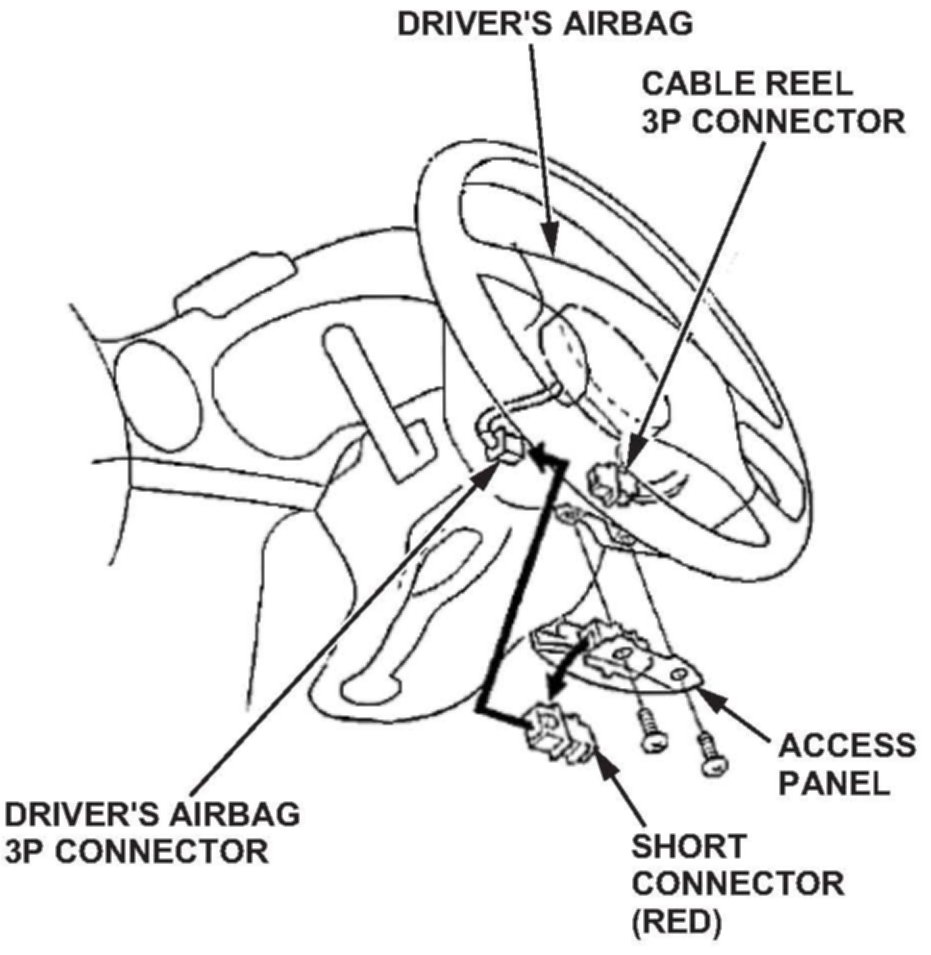 ^ Remove the access panel from the steering wheel, then remove the short connector (RED) from the panel.