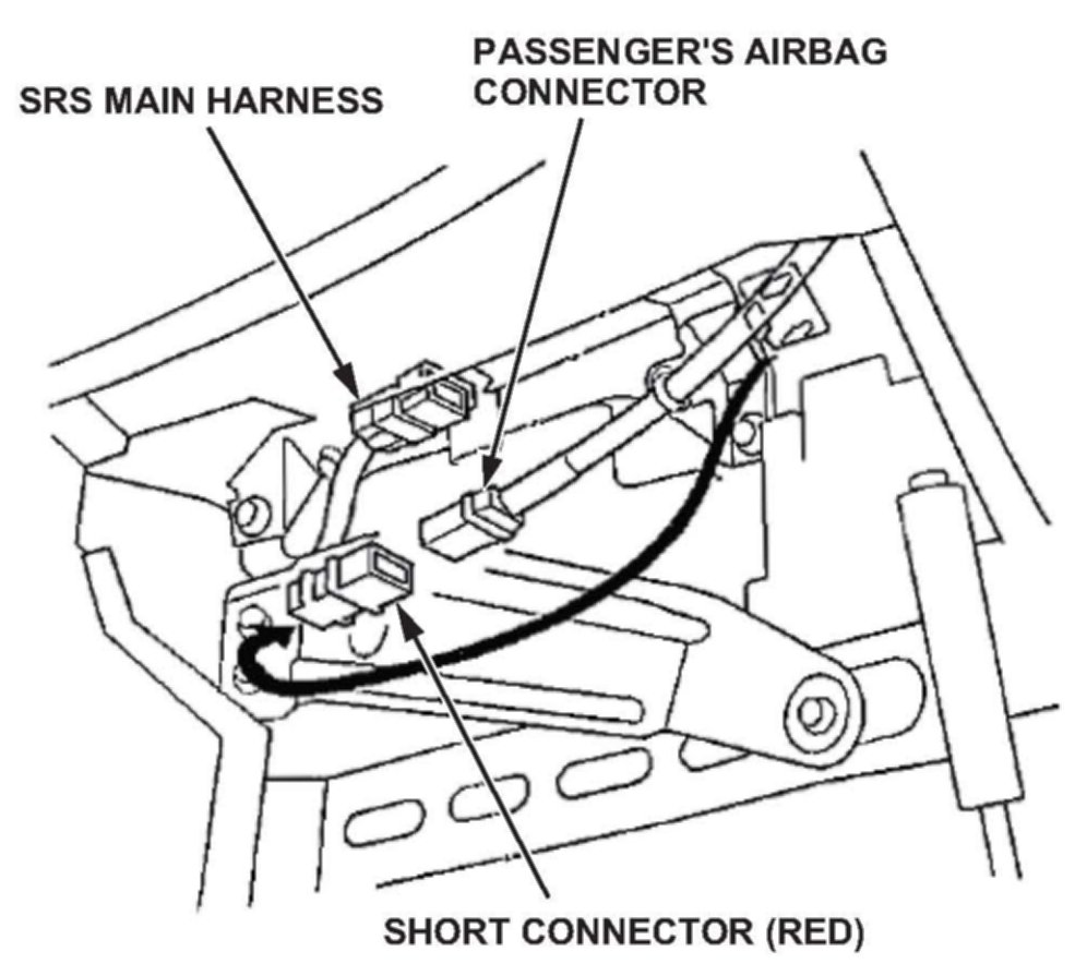 ^ Disconnect the 3P connector between the passenger's airbag and the SRS main harness, then connect the short connector (RED) to the GLOVE BOX passenger's airbag 3P connector.