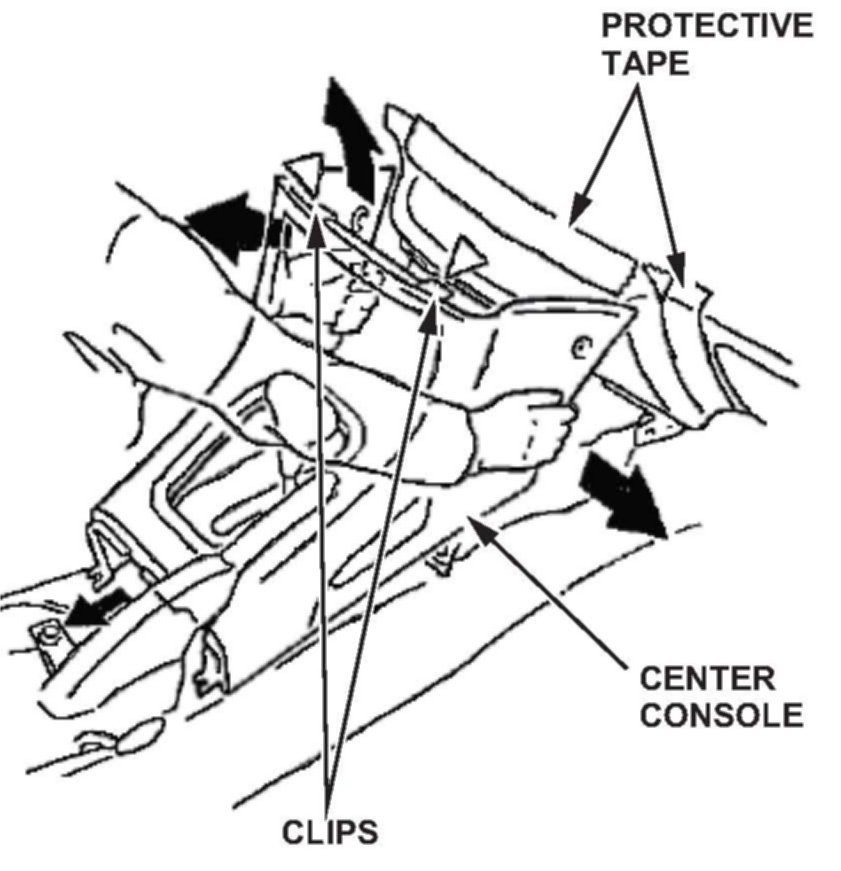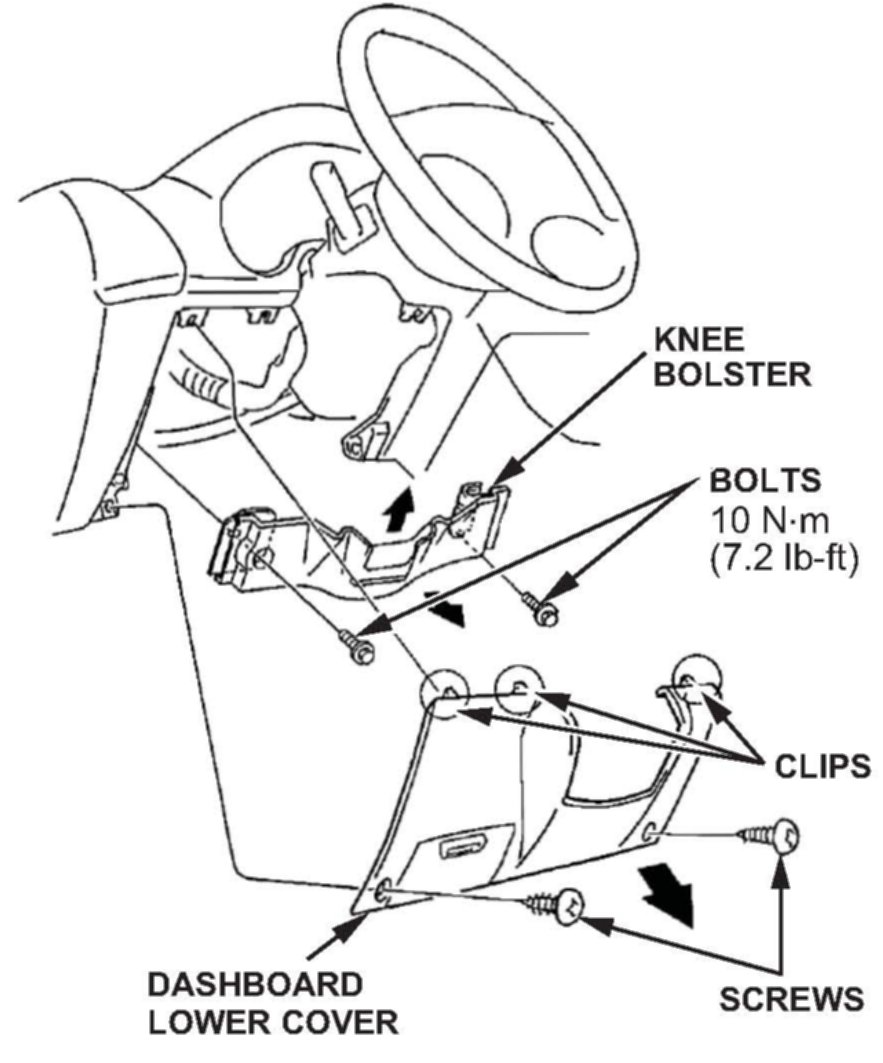 ^ Remove the screws, detach the clips, then remove the dashboard lower cover.