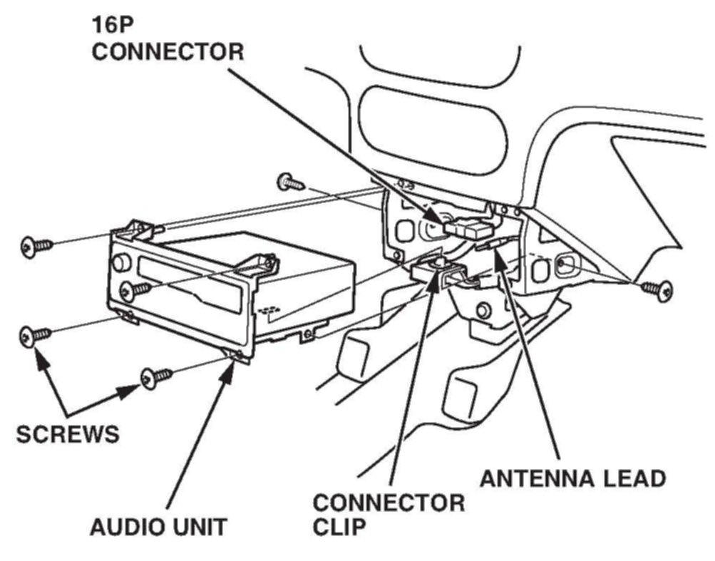 Carefully remove the six screws, then disconnect the 16P connector and the antenna lead. Detach the connector clip, then remove the audio unit.