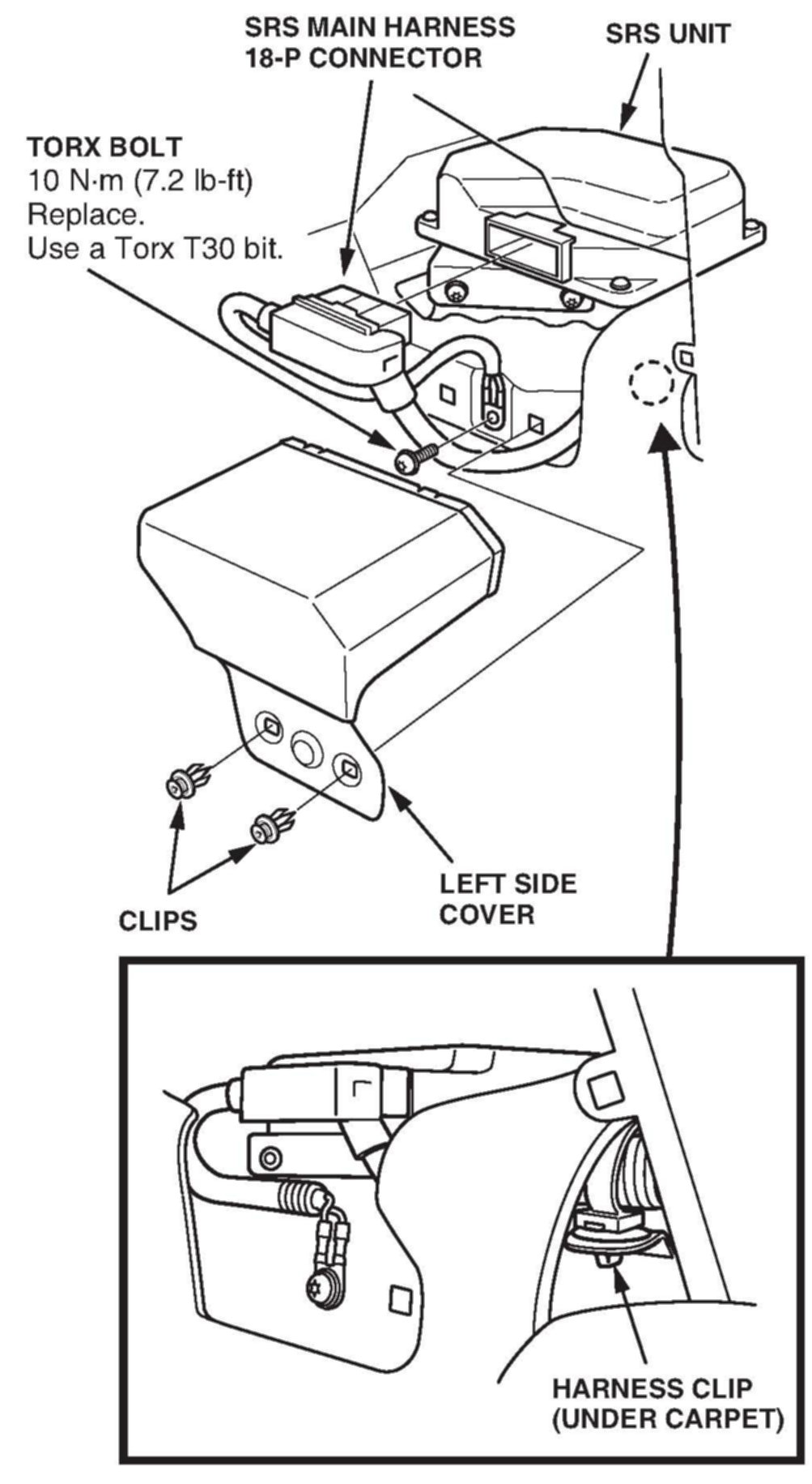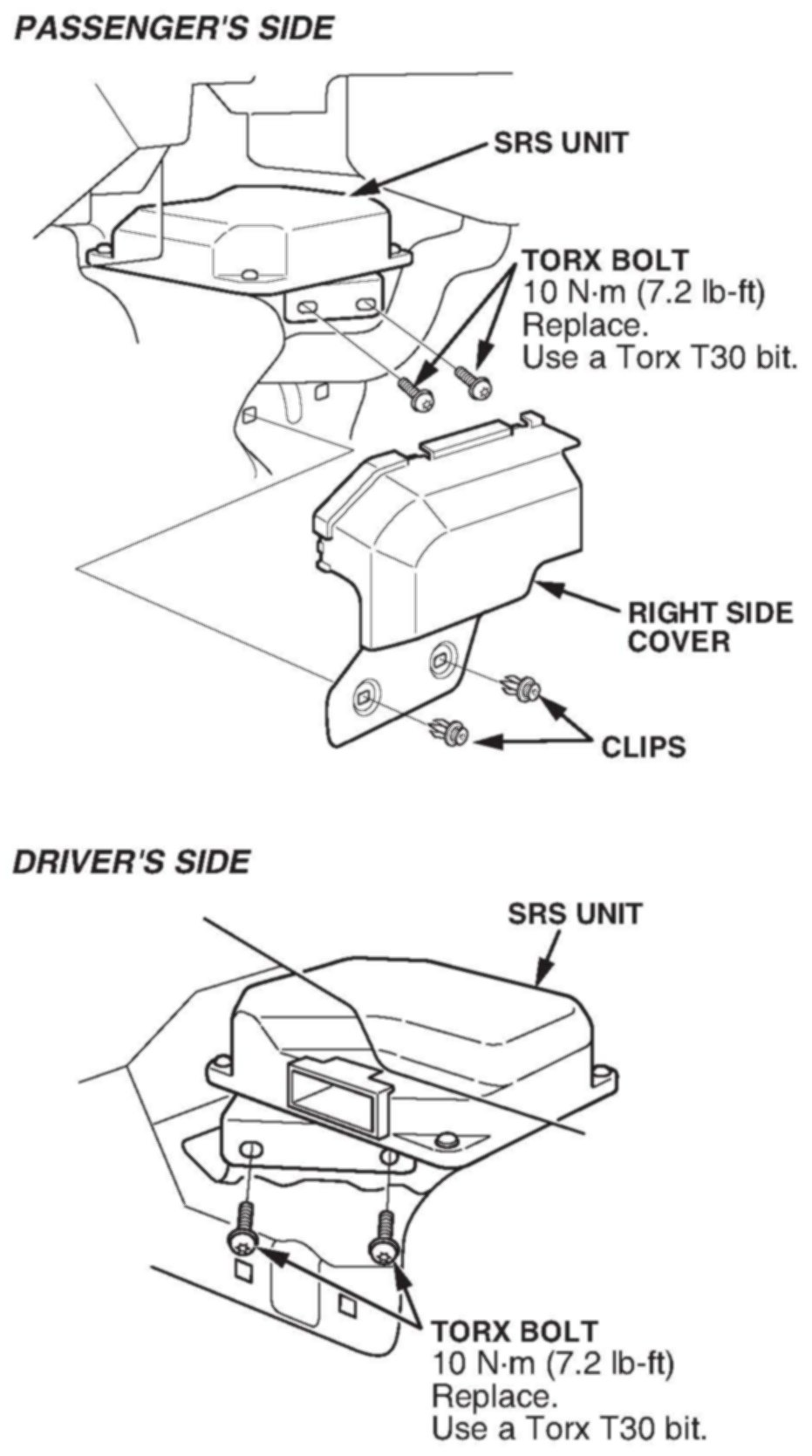 ^ Remove the four TORX bolts from the SRS unit, then remove the SRS unit from the driver's side.