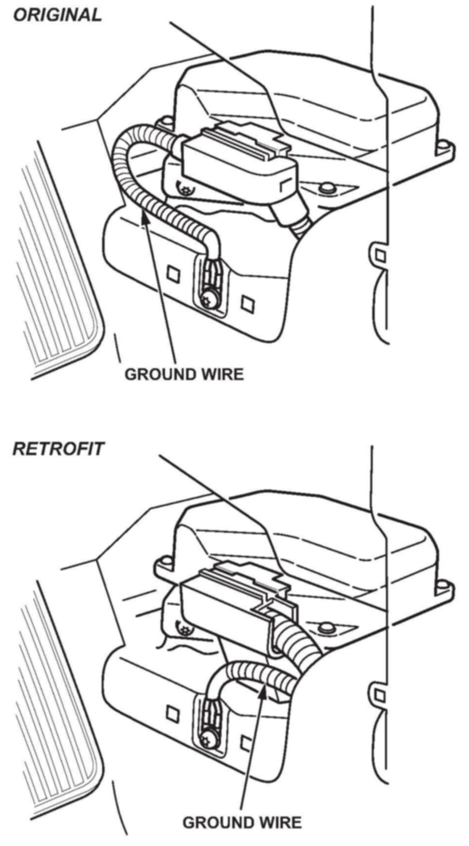12. Install the new SRS main harness in the reverse order of removal (see step 9), and note the routing change in the ground wire.