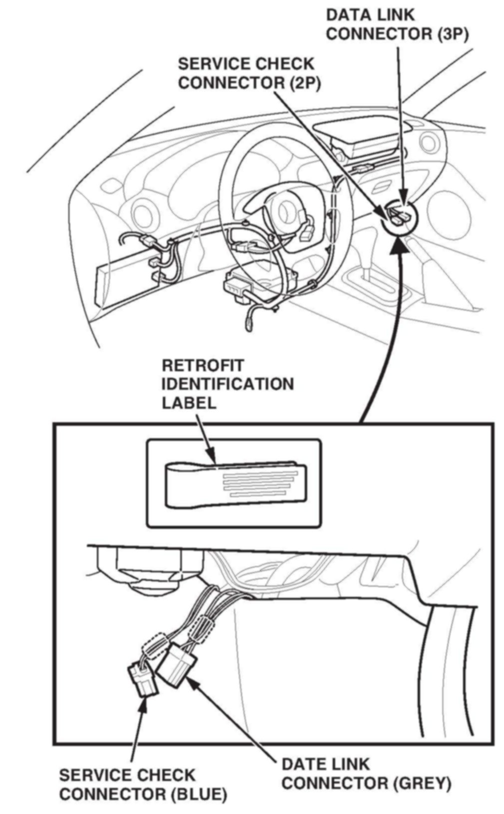 After the SRS unit and SRS main harness is replaced, do not use the original DTC troubleshooting. If you are troubleshooting a vehicle that has the SRS retrofit kit installed, you must use the new troubleshooting procedures designed for the SRS retrofit kit, which are available on ISIS only. You can identify these vehicles by checking for a SRS retrofit label attached to the DLC connector and the service check connector.