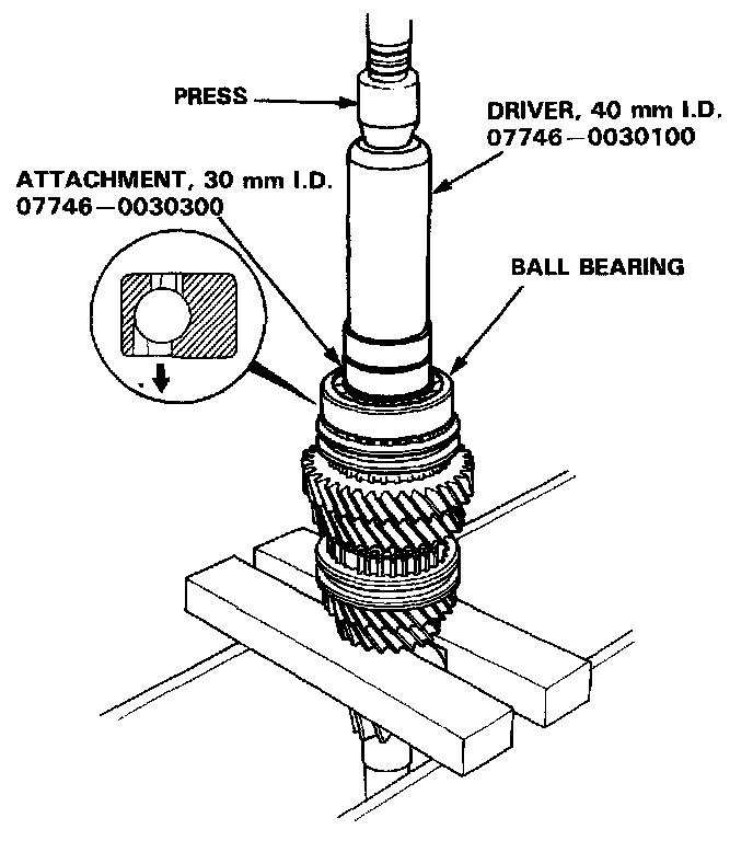 4. Install the ball bearing using the special tools and a press as shown.