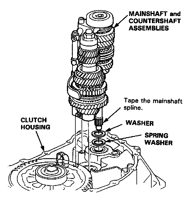 NOTE: Before removing the mainshaft and countershaft assemblies, tape the mainshaft spline to protect it.