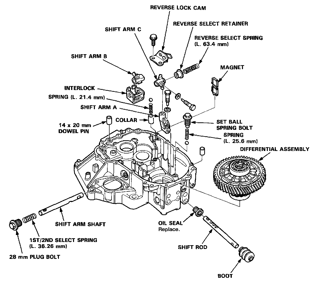 6. Remove shift arms C and B, and the interlock, then remove the reverse select spring and retainer.