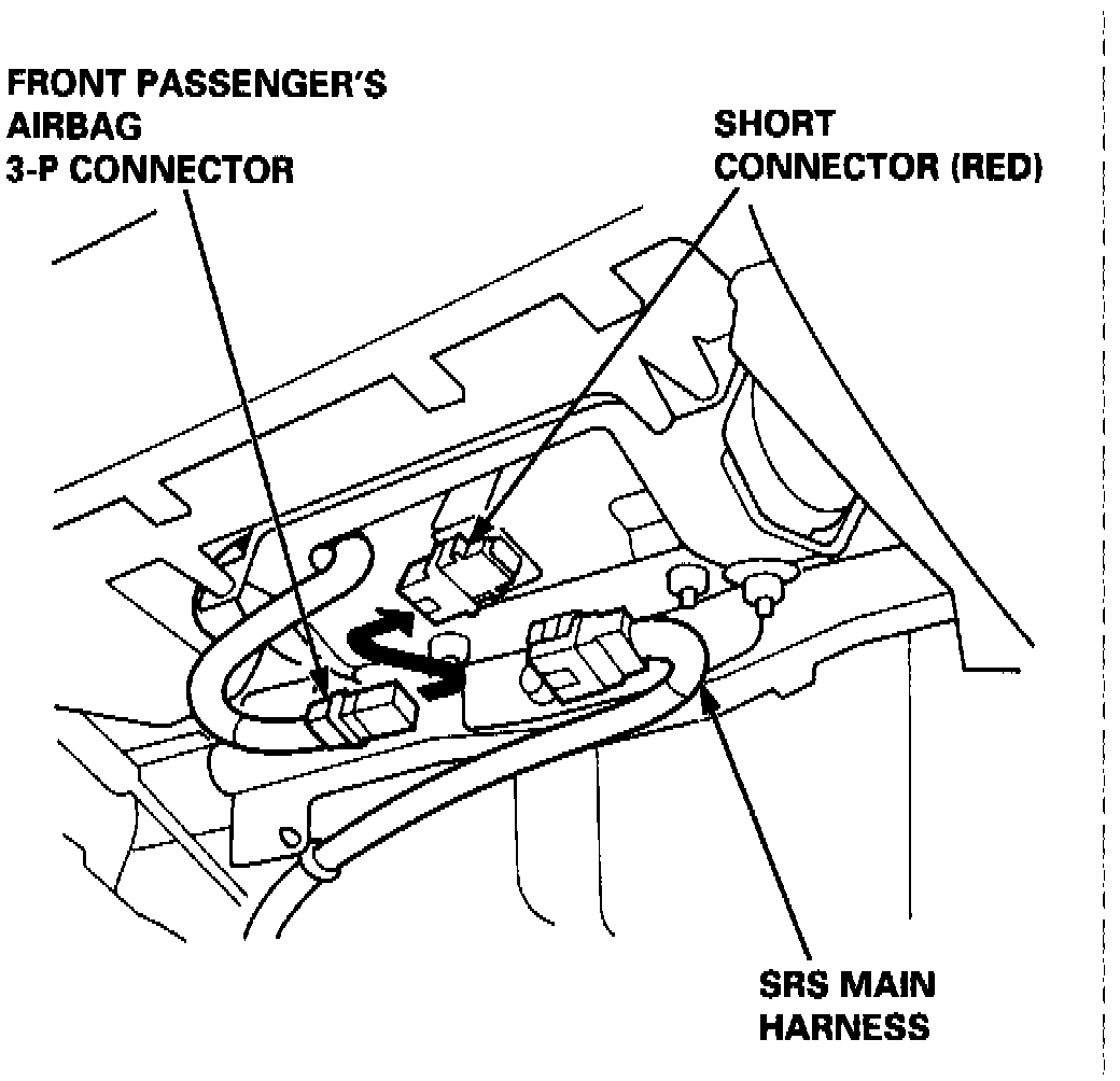 6. Disconnect front passenger air bag 3-P connector from SRS main harness and connect red short connector, Fig. 7.