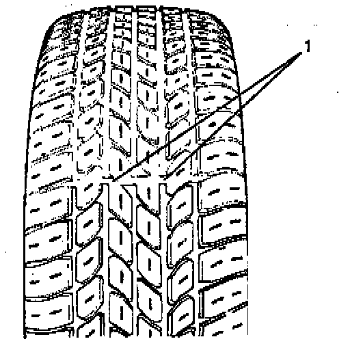 The original equipment tires have built-in tread wear indicators (1) to show when tires need replacement. These indicators may appear as wide bands. When the indicators appear in two or more grooves at three locations, tire replacement is recommended.