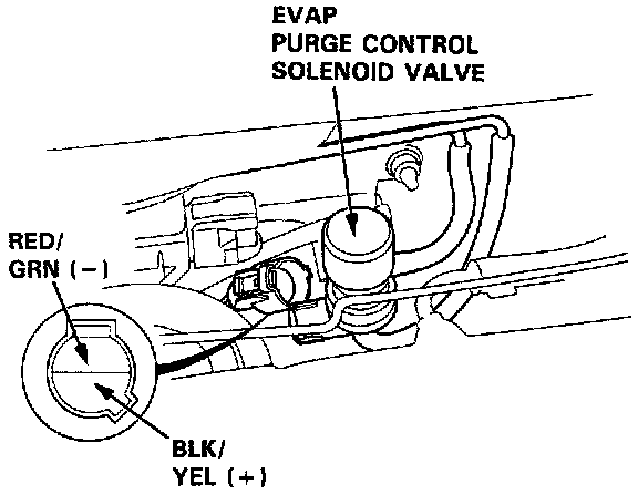^ Measure voltage between BLACK/YELLOW (+) terminal and the RED/GREEN (-) terminal. If there is battery voltage, replace EVAP Purge Control Solenoid Valve and retest.