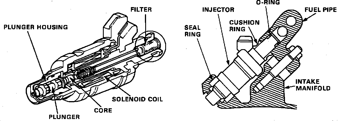The injectors are a solenoid-actuated constant-stroke pintle type consisting of a solenoid, plunger needle valve and housing. Each time power is applied to a fuel injector the pintle pulls up a preset amount and fuel is sprayed directly at the intake valve. Since fuel pressure and pintle lift are constants, by changing the amount of time the Programmed Fuel Injection Electronic Control Module (PGM-FI ECM) holds the Injector open (injector duration), the amount of fuel delivered can be precisely controlled.