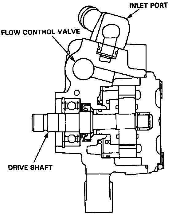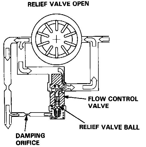 As pressure on the valve body unit side builds up, it pushes the relief valve ball (inside the flow control valve) up against its spring, and excess fluid returns to the pump inlet. As the pressure under the flow control valve drops, the relief valve ball is closed by its spring, and the flow control valve is forced down again, allowing excess fluid from the pump side to return to the inlet. This flow control valve-relief valve cylinder keeps pump output pressure between 7000 - 8000 kPa (70 - 80 kg/cm2, 995 - 1,138 psi).