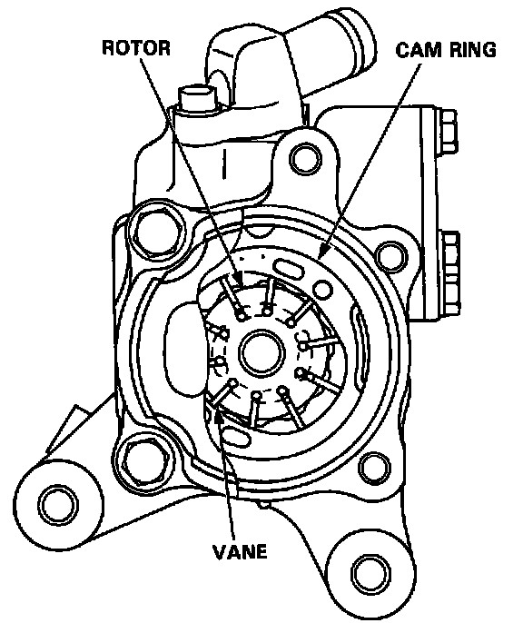 Steering Pump ConstructionThe pump is a vane-type incorporating a flow control valve (with an integrated relief valve) and is driven by a V-belt from the crank pulley. The pump features 10 vanes. Each vane performs two intake/discharge operations for every rotation of the rotor. This means that the hydraulic fluid pressure pulse becomes extremely small during discharge.