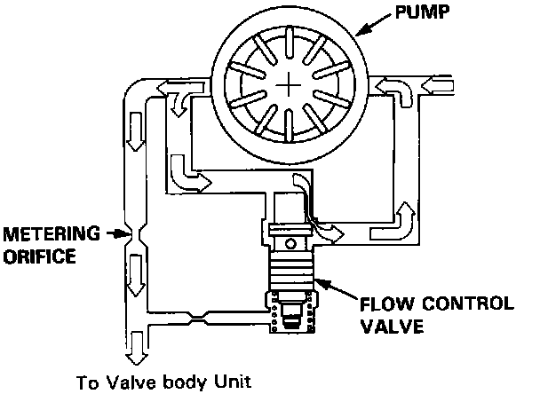 Fluid from the pump runs through a metering orifice to the valve body unit. This creates a pressure difference between the pump and valve body unit sides of the orifice. When pressure in the pump side is higher than the force of the spring holding the flow control valve closed, it pushes the valve down (open), and excess fluid returns to the pump inlet. The combined effect of the metering orifice and the flow control valve provides a relatively constant flow of fluid to the valve body unit.
