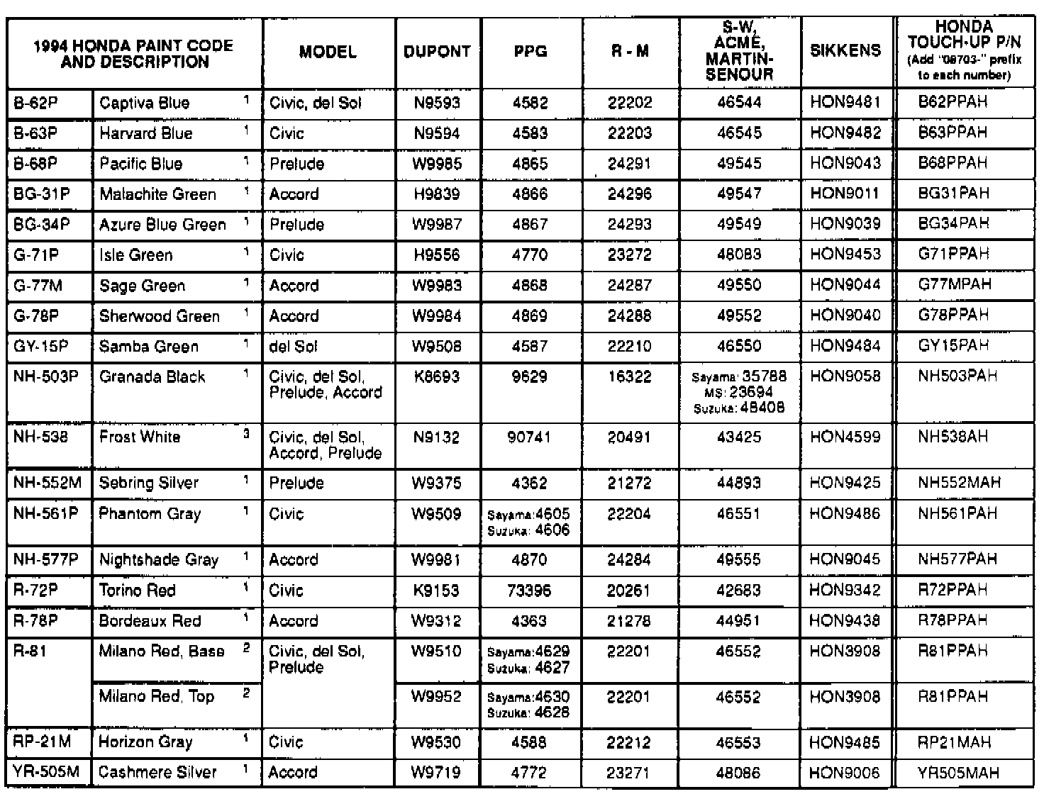 1994 Honda Paint Codes