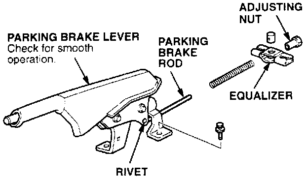 1. Remove the center console. Disconnect the parking brake rod from the equalizer. and remove the two bolts retaining the parking brake lever assembly.