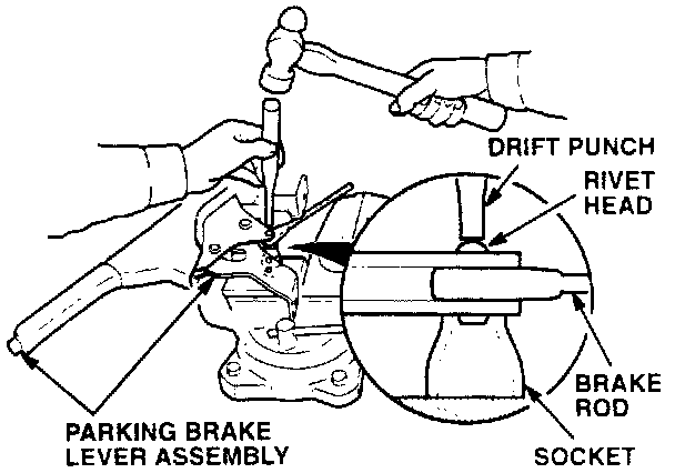 5. Have an associate hold the parking brake lever assembly while you hit the top side of the rivet several times with a 3/16 inch drift punch and a 24 ounce ball peen hammer, as shown.