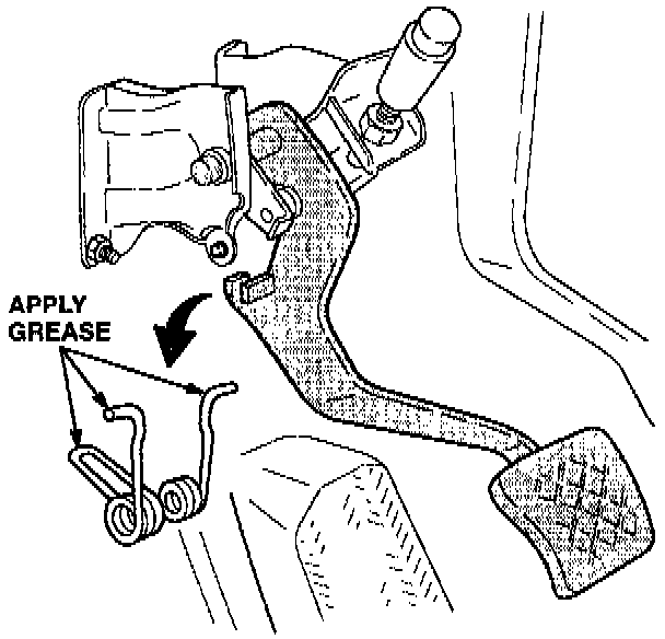 2. Apply high temp urea grease to the ends of the spring where they contact the bracket and to the center of the spring where it contacts the clutch pedal.