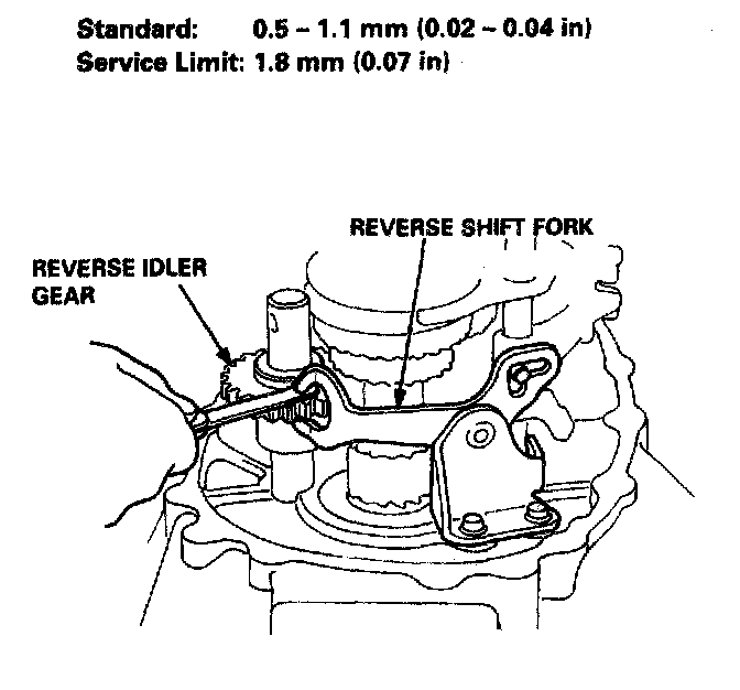 3. Measure the clearance between the reverse idler gear and reverse shift fork.