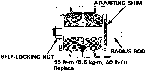 NOTE: Caster angle can be adjusted by increasing/decreasing the number of the adjusting shims. Remove and install the radius rod each time the caster angle is adjusted.