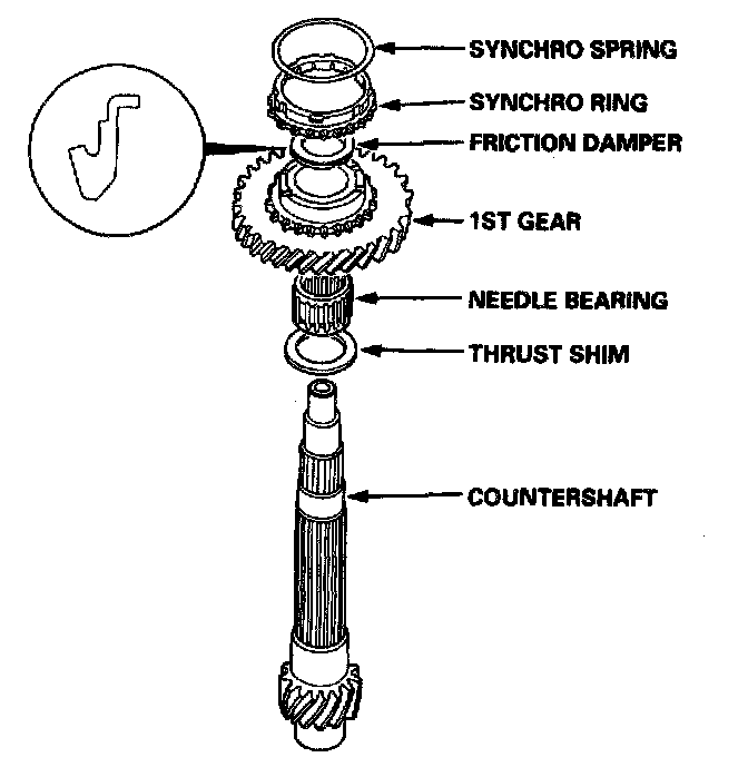 1. Install the thrust shim, needle bearing, 1st gear, friction damper, synchro ring, and synchro spring.