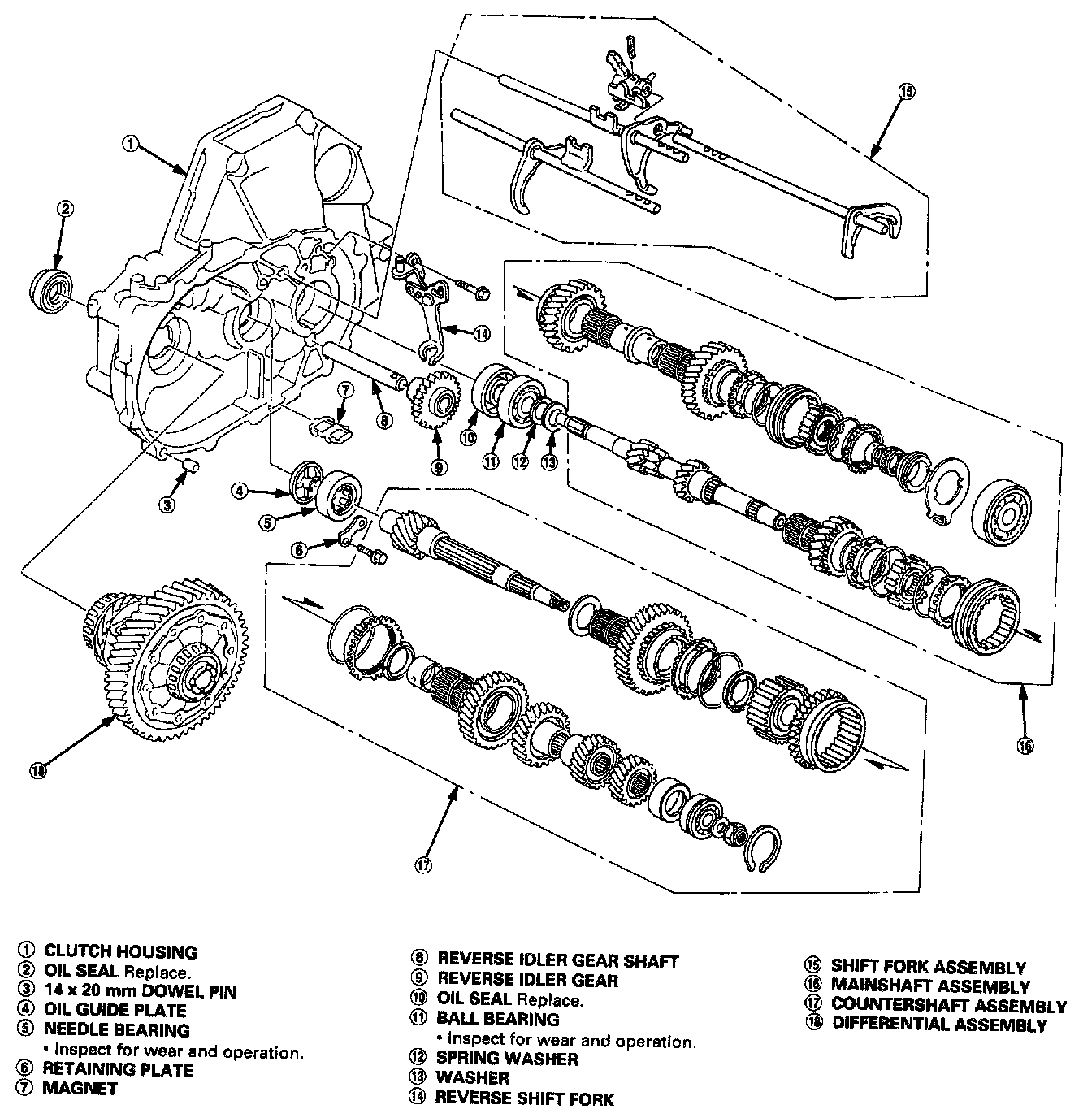 - Always clean the magnet (7) whenever the transmission housing is disassembled.