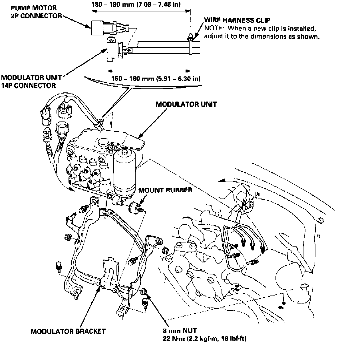 NOTE: When a new harness clip is installed after a wire harness or modulator unit replacement, adjust the harness clip to the dimensions shown below.