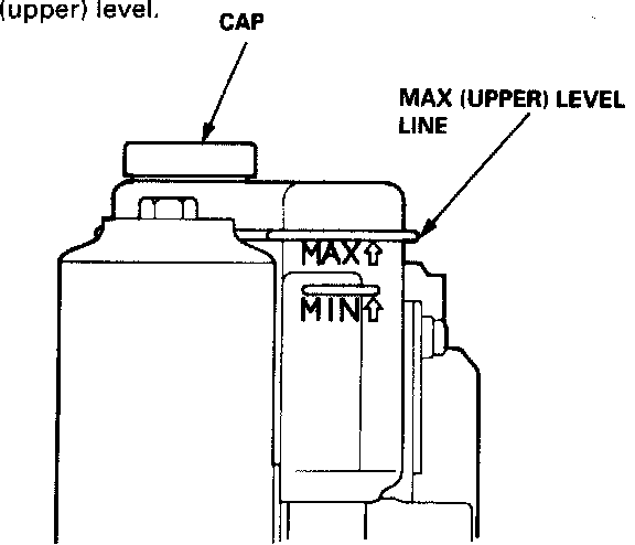 1. Check whether the brake fluid level in the reservoir is at the MAX (upper) lever. If level is low, add fresh brake fluid to the MAX (upper) level.