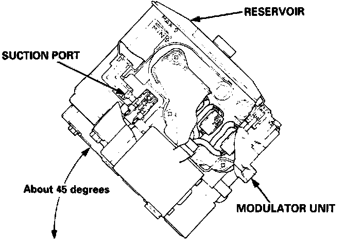 2. Before installing the modulator unit on the car, be sure to bleed the air from the suction port in the modulator unit by leaning the modulator unit to one side slowly (about 45 degrees) as shown.